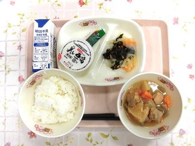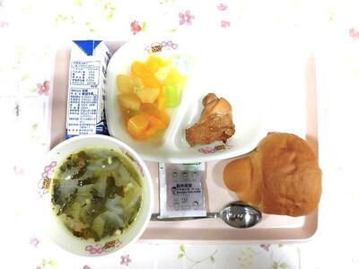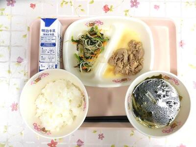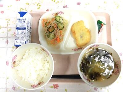 【献立】わかめごはん、牛乳、とりにくのレモンソースかけ、切干大根炒め煮、もずくの中華スープ