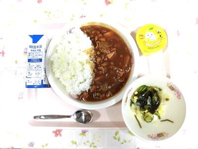 【地産地消献立】もち麦ごはん、牛乳、あさのポークカレー、かんぴょうサラダ、県産ヨーグルト
