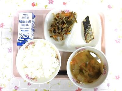 【献立】ごはん、牛乳、あじの塩焼き、五目きんぴら、かんぴょうのみそ汁