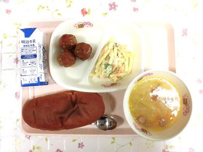 【献立】バターコッペパン、牛乳、ミートオムレツ、ツナキャベツサラダ、肉団子と春雨のスープ