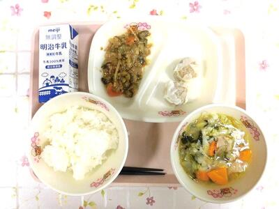 【献立】ごはん、牛乳、ポークしゅうまい、マーボーなす、ワンタンスープ
