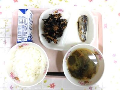【献立】ごはん、牛乳、いわしのおかか煮、ひじきの炒め煮、満点みそ汁