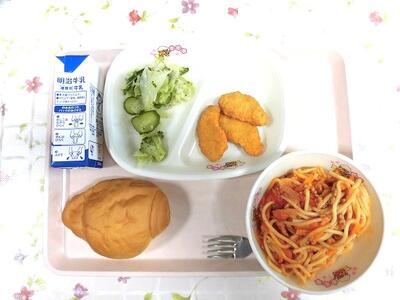 【献立】バターロール、牛乳、チキンナゲット(3)、スパゲティナポリタン、コーンサラダ