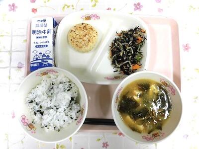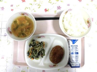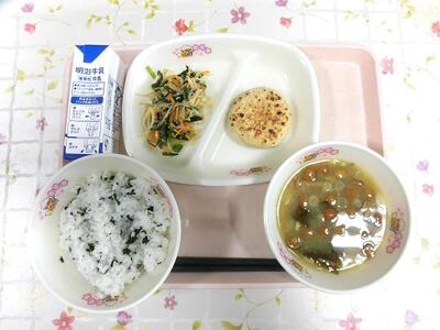 【献立】わかめごはん、牛乳、きんぴらハンバーグ、ひじきとツナの彩りナムル、なめこ汁