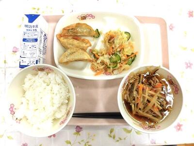 【献立】ごはん、牛乳、揚げぎょうざ(3)、切干大根とささみのサラダ、茎わかめのスープ