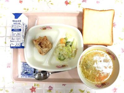 【献立】ミルクパン、牛乳、チキンのチーズパン粉焼き、かいそうサラダ、ミネストローネ
