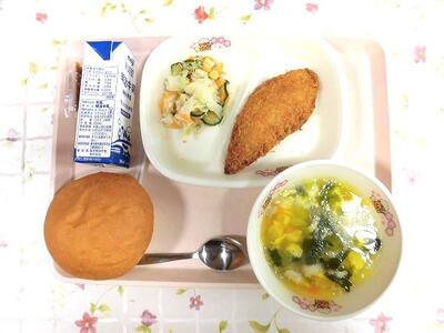【献立】バターコッペパン、牛乳、カレーコロッケ、切干大根の中華サラダ、ふわふわスープ、とちあいかいちごジャム