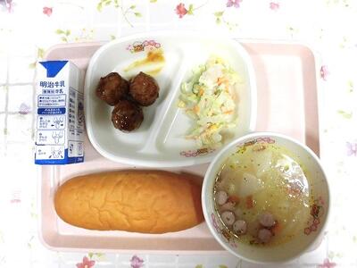 【献立】ミルクパン、牛乳、照焼肉団子、ツナ入りキャベツサラダ、ポトフ
