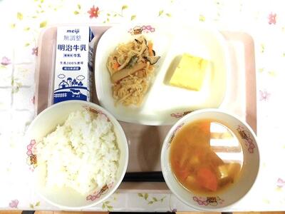 【献立】ごはん、牛乳、ぶたにくと野菜の生姜炒め、ごぼうサラダ、豆腐とわかめのみそ汁