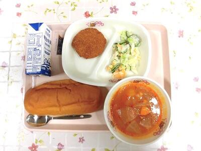 【献立】ミルクパン、牛乳、メンチカツ(ソース)、イタリアンサラダ、トマトクリームシチュー