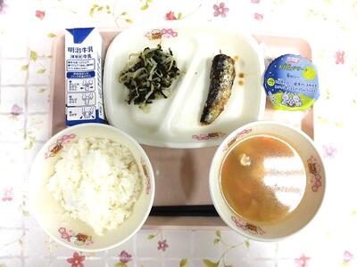 【献立】ごはん、牛乳、焼き魚(さわらのみそ焼き)、茎わかめの五目きんぴら、じゃがいものみそ汁