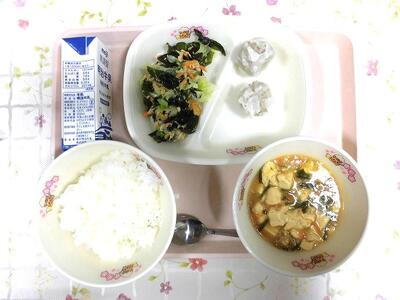 【献立】ごはん、牛乳、マーボー豆腐、ポークしゅうまい、ツナとわかめのあえもの