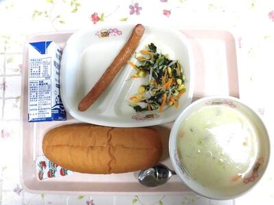 【献立】スライスバターコッペパン、牛乳、ロングウインナー、ケチャップ、ポパイサラダ、さつまいもシチュー