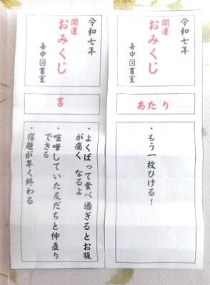 先週のアンケート結果と、今週のアンケートです。現在、本を借りるとおみくじを引くことができます。写真は、私が引いたおみくじです。