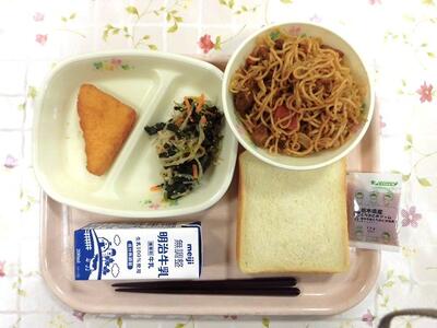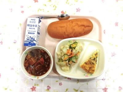 フルーツクリームサンド(コッペパン・フルーツクリーム)、牛乳、スペイン風オムレツ、ミネストローネ