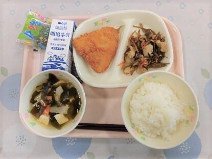 ごはん、牛乳、アジフライ、茎わかめの五目金平、若竹汁、かしわもち