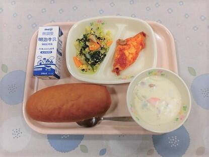 バターロールパン、牛乳、ミートオムレツ、ブロッコリーとチーズのサラダ、さくまいものクリーム煮