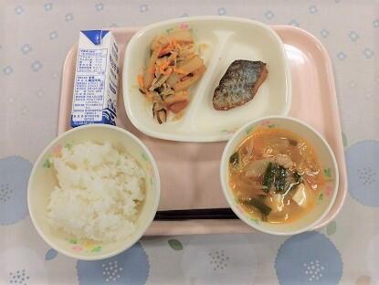 ごはん、牛乳、煮魚(サバの味噌煮)、ほうれんそうのごまあえ、とん汁