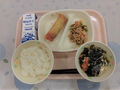 ごはん、牛乳、はるまき、チンジャオロース、わかめとたまごのスープ