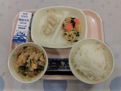 ごはん、牛乳、ポークシュウマイ、マーボーなす、かにかまぼこときくらげの卵スープ