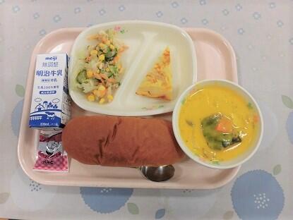 本日の給食は、「パンプキンポタージュ」です。