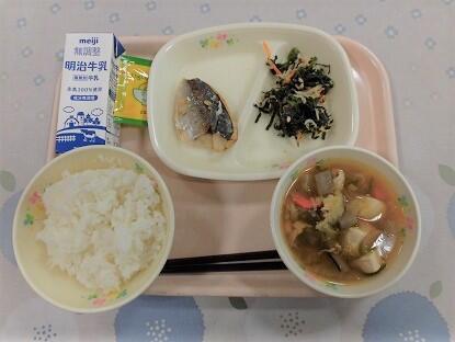 ごはん、牛乳、焼き魚(さわらスタミナ焼き)切干大根炒め煮、とん汁