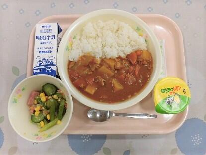 麦ごはん、牛乳、ポークカレー、アスパラとハムのサラダ、まちみつレモンゼリー