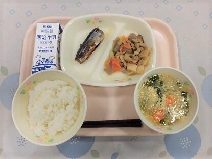 ごはん、牛乳、煮魚(秋刀魚かぼすレモン煮)、筑前煮、にらとかんぴょうのかきたま汁