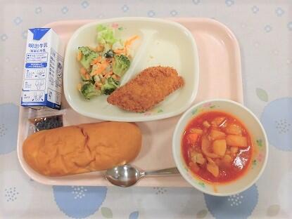 バターロールパン、牛乳、白身魚のフライ、海草サラダ、トマトクリームシチュー