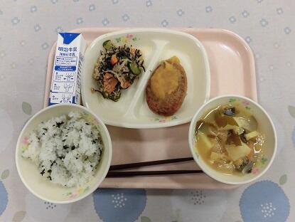 わかめごはん、牛乳、ハンバーグおろしソースかけ、ひじきとツナの彩りナムル、じゃがいものみそ汁