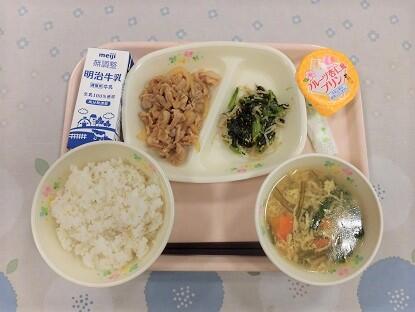 ごはん、牛乳、ぶた肉と野菜の生姜炒め、ギョウザスープ、フルーツ豆乳かん