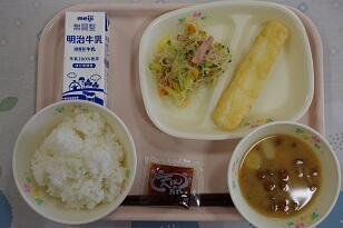 ピザトースト、牛乳、ハムチーズカツ、フルーツポンチ、ミートボールと野菜のカレー煮