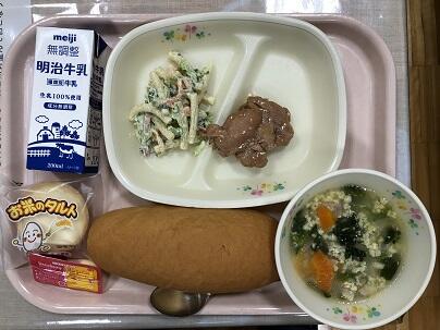 コッペパン、ジャム&マーガリン、牛乳、照り焼きチキン、マカロニサラダ、ふわふわスープ、お米のタルト