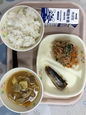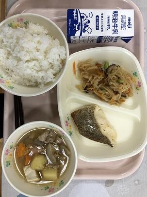 ご飯、牛乳、焼き魚、切り干し大根炒め煮、豚汁