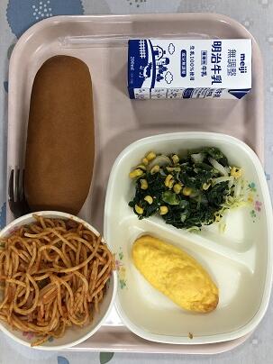 ミルクパン、牛乳、スパゲティナポリタン、オムレツ、ちくわのごまドレッシングあえ