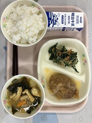 ごはん、牛乳、ハンバーグおろしソースかけ、ほうれん草のごま和え、ジャガイモのみそ汁