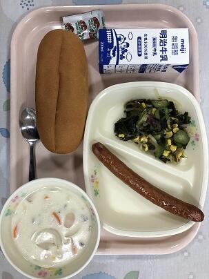 セルフホットドッグ、牛乳、海藻サラダ、白インゲンのポタージュ