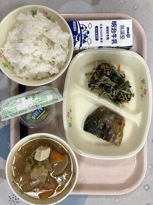 ごはん、牛乳、鯖味噌煮、磯辺和え、けんちん汁、ゼリー