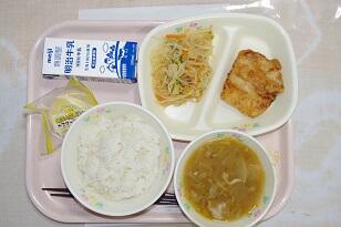 麦ごはん、牛乳、からあげ、春雨サラダ、豚汁、レモンタルト