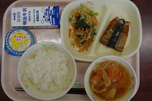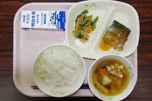 ごはん、牛乳、さばの味噌煮、にらの和風あえ、のっぺい汁