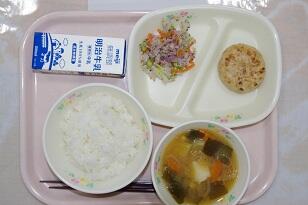 ごはん、牛乳、きんぴらバーグ、ゆかりあえ、道産子汁