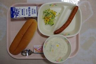 シュガーパン、牛乳、肉団子、キャベツサラダ、秋味シチュー、リンゴゼリー