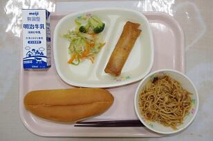 セルフ焼きそばパン、牛乳、春巻、ちりめんじゃこのサラダ