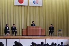 4/16(月)の午後、本校を去られた6名の先生方の離任式を行いました。「喜中はやりたいことができる学校」「やり切ることが大事」「夢は諦めなければ叶う」「勉強に運動にがんばってほしい」など、先生方から生徒たちにお話がありました。生徒会長から先生方に「これからも教えていただいたことを忘れずに、しっかりとした学校生活を送っていきます。」と、お別れのあいさつと決意がありました。先生方のご恩に報いるためにも喜中生にはいっそうがんばってほしいと思います。