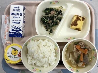 ごはん、牛乳、厚焼きたまご、ツナとほうれん草のごま和え、豚肉と大根の煮物、ゆずゼリー
