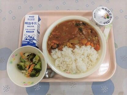 麦ごはん、牛乳、なす入りポークカレー、ブロッコリーとジャコのサラダ、県産ヨーグルト
