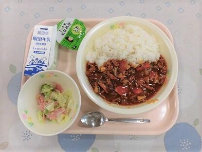 麦ごはん、牛乳、きのこのハッシュドポーク、マリネサラダ、抹茶プリン