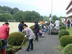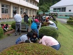 校庭の除草と斜面の草刈り、校舎北側のドウダンツツジの剪定とむし暑い中、一生懸命に取り組みました。