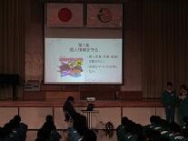 「今年度の給食も今日で最後です。好きなメニューや苦手なメニューといろいろあったと思います。給食には家庭で不足しがちな栄養をとることや、いろいろな料理や食材に触れること、食品の生産や流通について知ること、また、食べ物に感謝する心を育てることなどの役割があります。今は苦手なものも、少しずつ味わって、食べることができるようになってほしいと思います。自分の体は、自分の食べてものでつくられています。健康な体づくりのために、食事の管理ができる人になってくださいね。」
