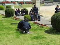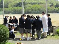 今日は、春らしい爽やかな日でした。1年生は理科の植物の観察で、校舎前に出て学習していました。喜中の周りの山々に目をやると、すでに新緑に変わってきています。